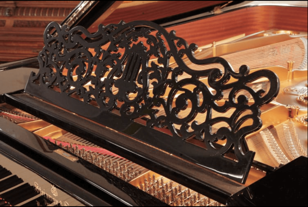 本琴最吸睛的特色之一,是那個 細緻鏤空設計的譜架:以葉片造型為主題,中央搭配 Lyra(里拉)圖案,線條優雅、雕工細膩,完全展現 Steinway & Sons 在美學與工藝上的高標準。琴腳為 車旋立柱並帶有雕刻裝飾,在支撐結構與外觀設計之間取得完美平衡,展現出 19 世紀後期典型的裝飾風格。