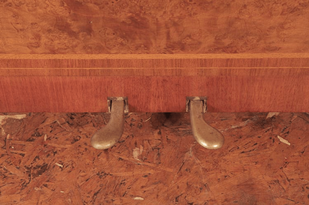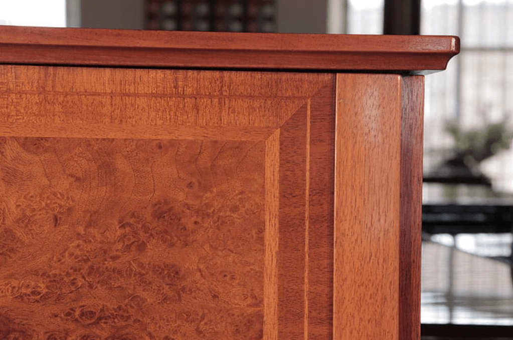 前方面板採用 鏡面處理的樹瘤胡桃木貼皮(Wurzelwalnuss),外圈再以對比色胡桃木嵌木裝飾,